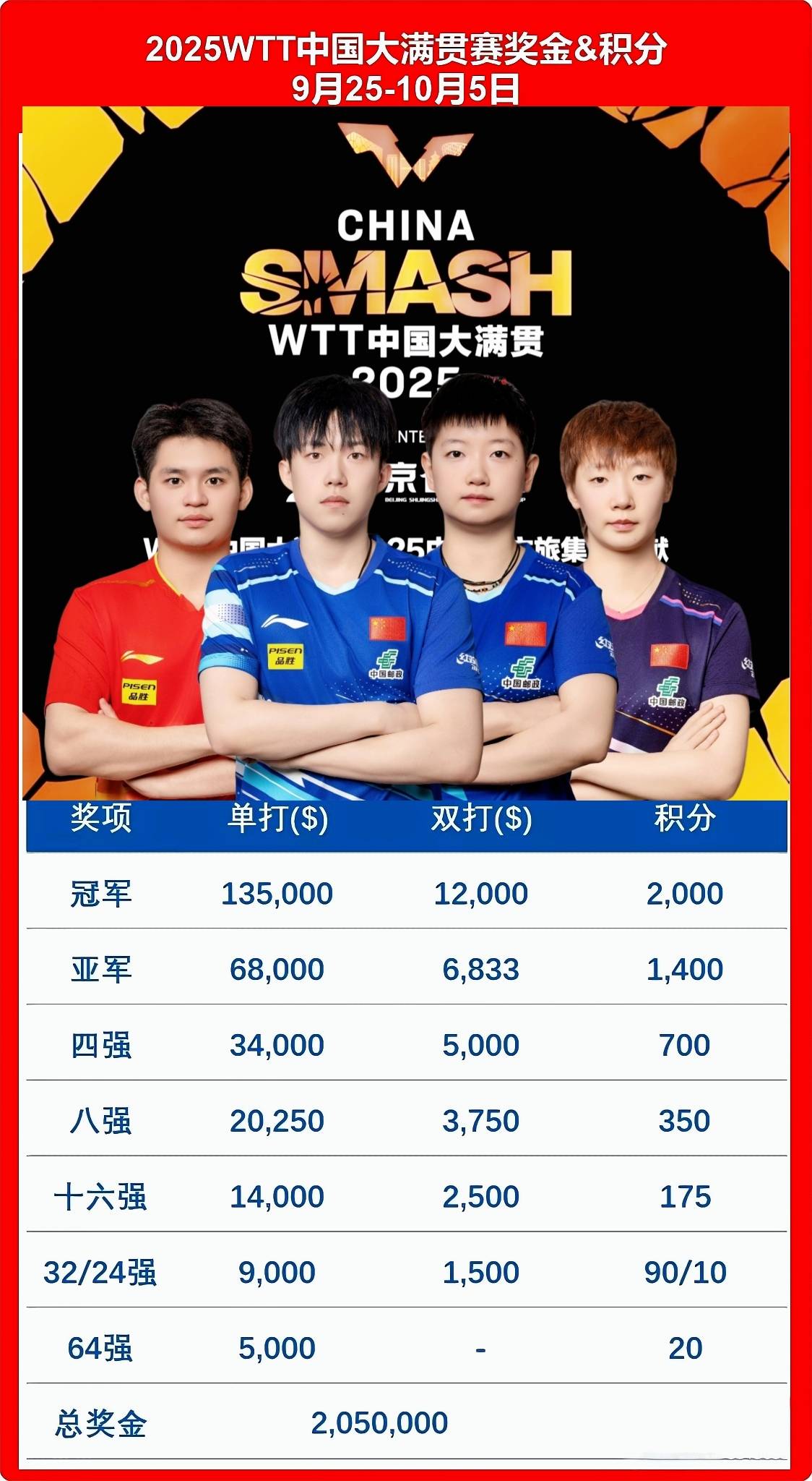 本届中国大满贯的总奖金为205万美元,是WTT创办以来最高的奖金标准。参赛选手,尤其是那些成绩优异的选手,赚取了不少奖金。其中,获得三冠的王楚钦和双冠的王曼昱分别位居奖金榜前两位,王楚钦获得了106万元人民币,而王曼昱则收获了102万元人民币。相比之下,最少奖金的资格赛选手也能拿到1000美元(约合7200元人民币)。