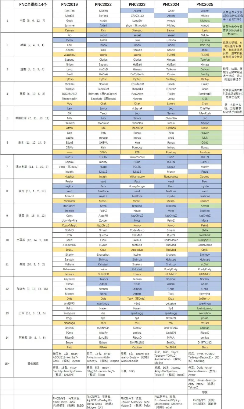 前言:PNC已经举办了4届,是PUBG电竞最重要的顶级赛事之一!目前全勤的国家或地区有14个,今年更是首次将国家或地区代表队扩军到24个!竞争更激烈、赛程更长!期待欧洲克罗地亚、塞尔维亚、捷克、芬兰和亚洲黎巴嫩、哈萨克斯坦等更多国家以后都能加入PNC大家庭,也希望FPS强手如云的俄罗斯和乌克兰有朝一日能同时加入PNC的竞逐~就在昨天,完整的PNC2025名单出炉,故有作此贴的想法,方便大家了解、查阅PNC的基础信息及历史情况~