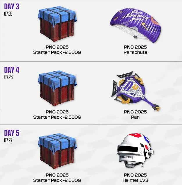 第1天和第2天的生存赛免费入场(但仍需订票操作),第3天至第5天决赛需付费入场,统一座位票价:5万韩元(约264元人民币)(据PKL-info博主发的信息,目前可能仅有少量生存赛门票,决赛早鸟票每日发售后的1分钟就售罄了)。所有付费购票的观众将获得价值2500 G币的PNC2025入门包以及PNC2025每日 特别道具等奖励,现场观众还能体验各种粉丝活动,如粉丝签名会、幸运抽奖及PUBG特别表演等。具体地,每日购买门票的虚拟奖励是这样的: