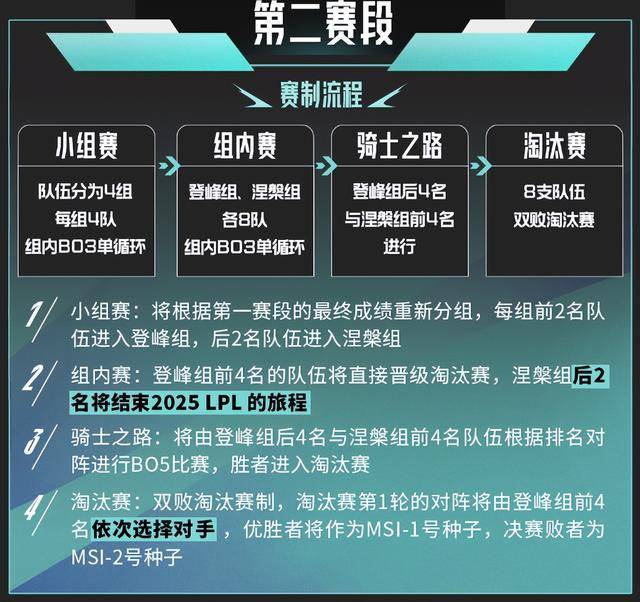 第二赛段则安排在3月至6月,常规赛形式与今年夏季赛类似,分为小组赛、组内赛和骑士之路。然而,这一赛段对于弱队来说尤为残酷,因为排名最后的两支队伍将直接被淘汰,结束全年的比赛。而第二赛段的冠亚军则将获得参加MSI的资格。