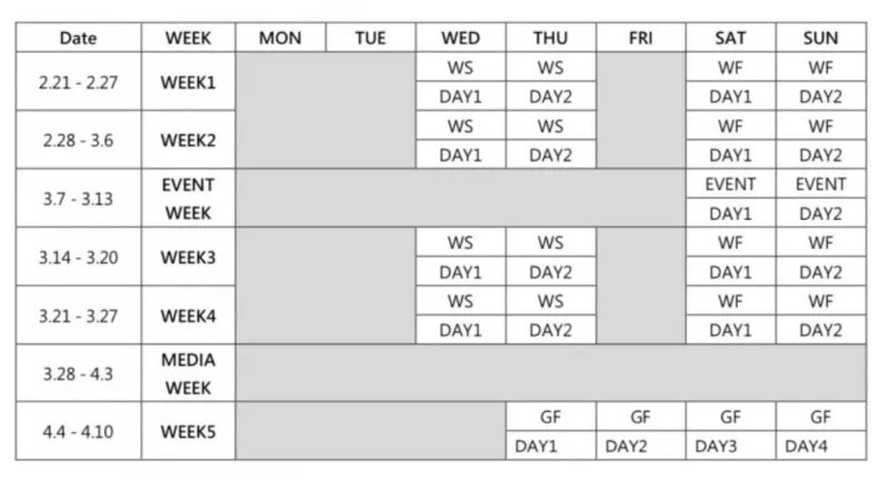 (3)总决赛(GRAND FINAL):第五周开始进行4天,每天5场共20场