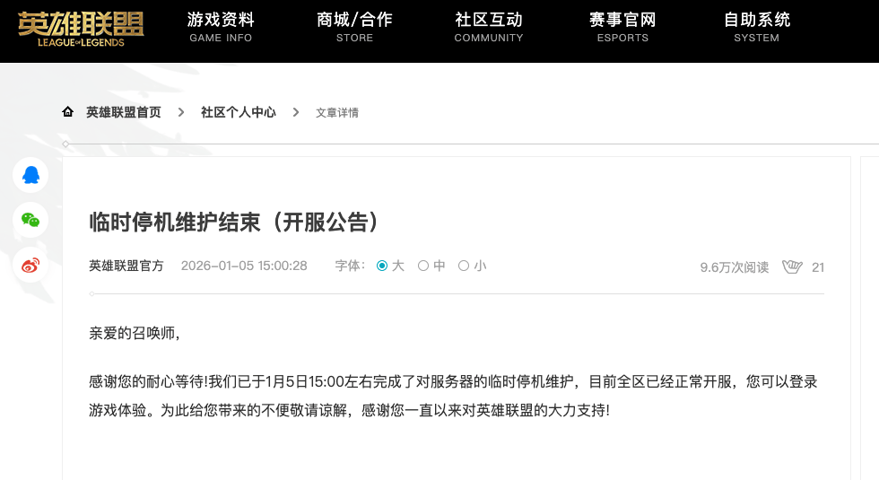 1月5日凌晨5点左右,游戏《英雄联盟》官网发布了临时停机维护公告。游戏于凌晨5点前后对全区进行临时停机维护,维护期间玩家无法登录游戏。直至10个小时后的下午15点,《英雄联盟》官网才发布开服公告,称已完成了对服务器的临时停机维护,目前全区已经正常开服。