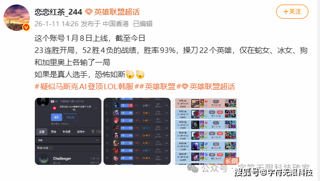 近日,根据《英雄联盟》知名爆料博主“恋恋红茶”的消息称,有玩家发现一个神秘账号正在横扫韩服,从1月8日开始仅用了56局游戏就从钻石以下段位打到了韩服前列,甚至一度登顶韩服!