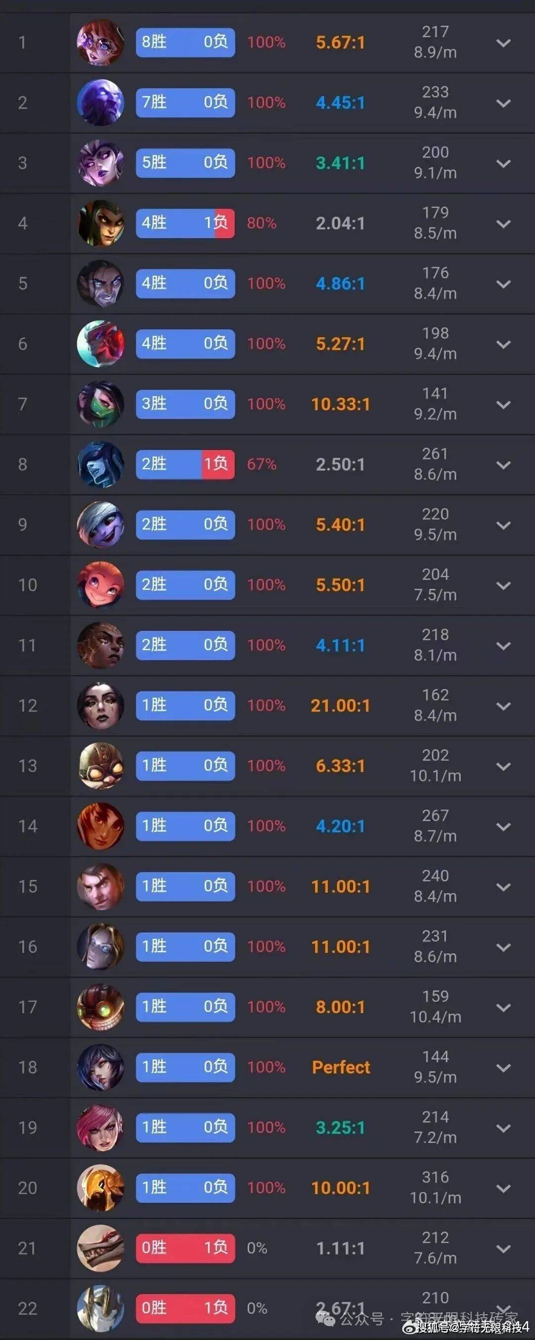 而且这号主是个“全能王”,操刀了22个英雄,除了蛇女、冰女、狼母和加里奥这四个英雄各输了一局外,其他对局几乎是“零失误”。