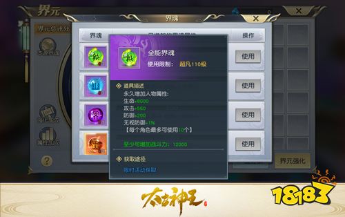 如果你在探索中获得了名为“界魂”的神秘道具就可以进行界元附魔了,目前游戏共有6种不同的界魂,附魔后可以永久增加人物各项属性,堪称是“洗经伐髓”级别的极品宝物!所以如果你得到了界魂一定不要犹豫,赶紧打开界元系统附魔让自己的战力瞬间暴涨吧!