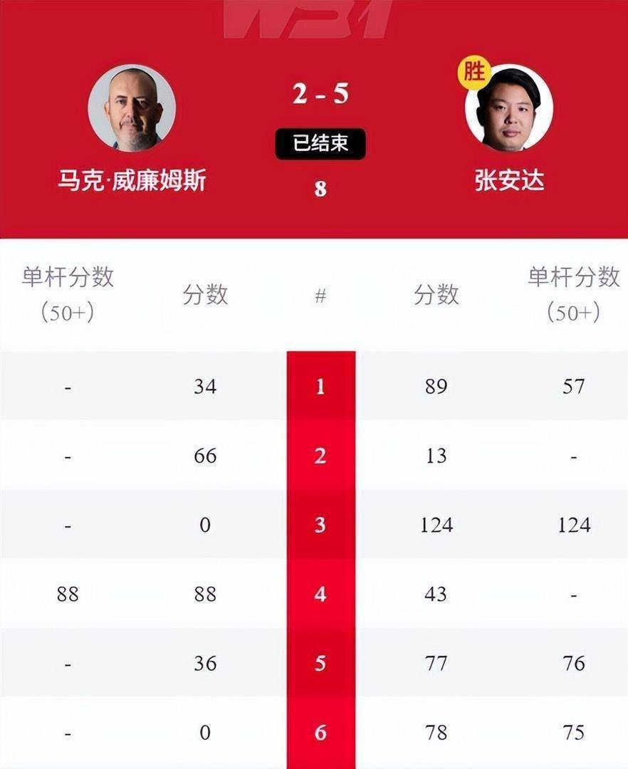 终场比分定格在5比2,张安达完成了这场赛前被普遍视为“爆冷”的胜利。 全场比赛的技术统计清晰地反映了进程:张安达打出了一杆破百(124分)和三杆50+(57、76、75分),而状态不佳的威廉姆斯仅在第四局打出了一杆88分。 张安达标志性的、被一些球迷戏称为“磨”的慢节奏和稳健打法,在这场比赛中成了限制威廉姆斯快节奏进攻的利器,他用自己的方式掌控了比赛。