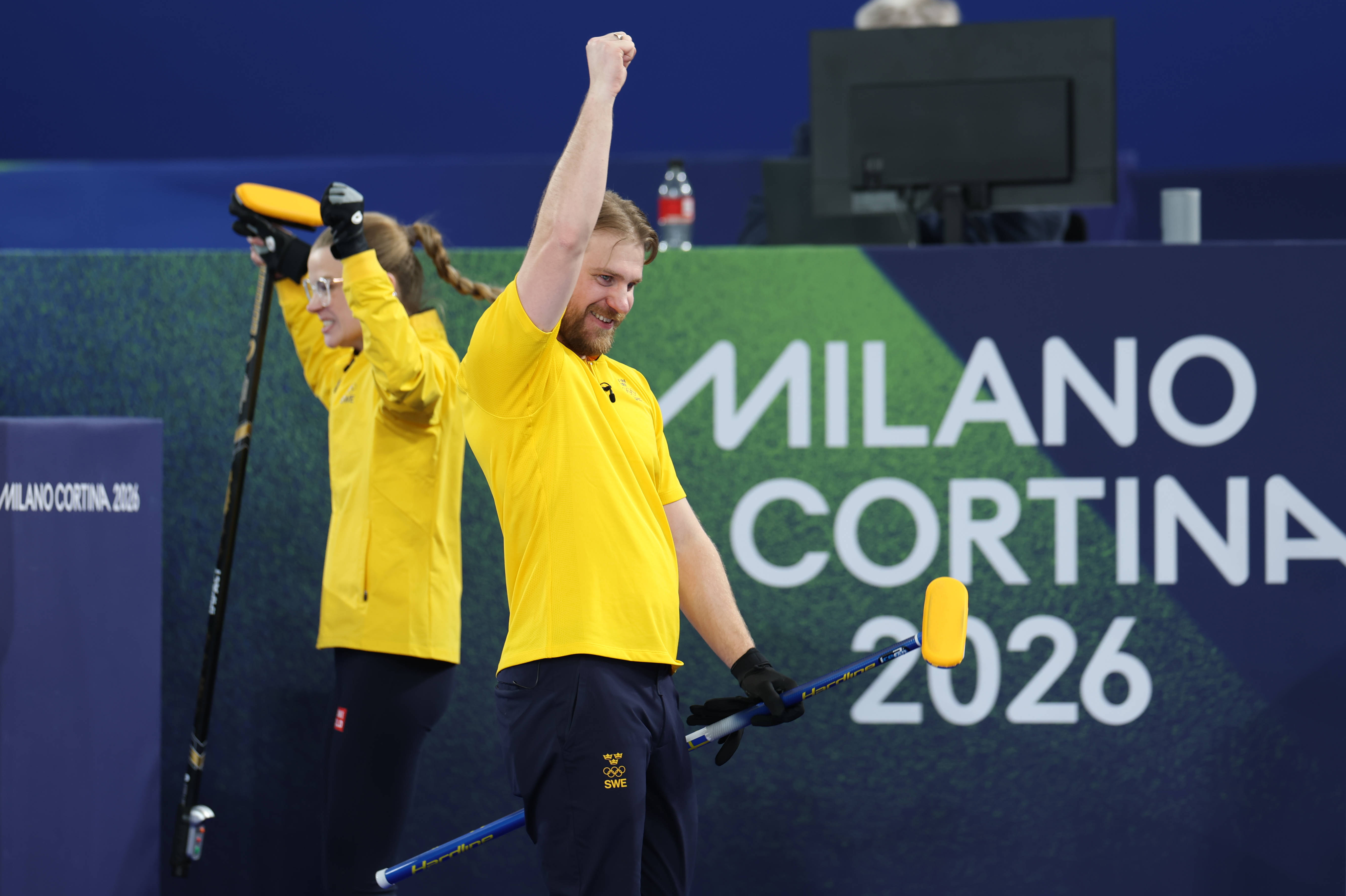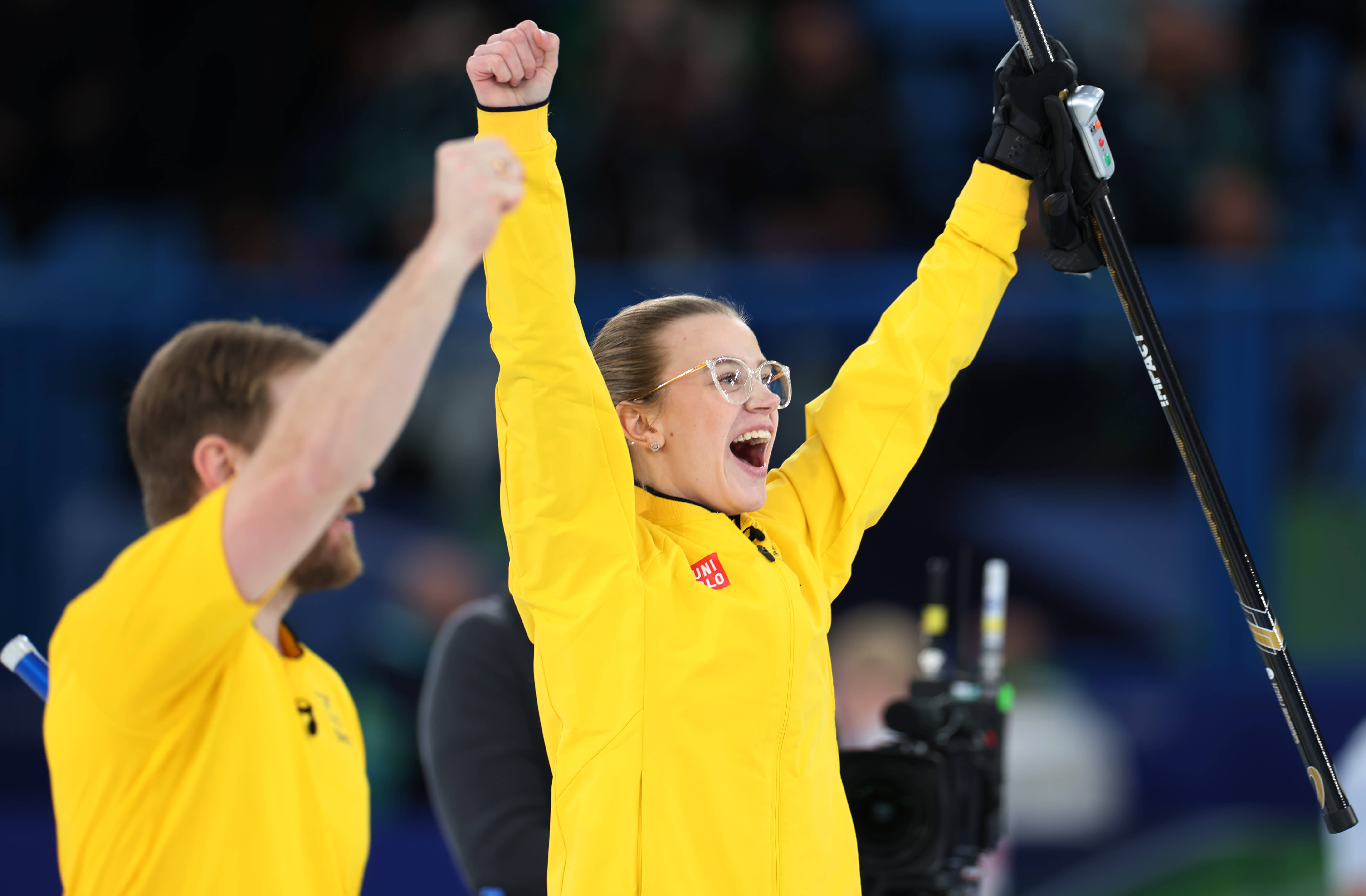 2月9日,瑞典队选手拉斯穆斯·弗拉纳和伊莎贝拉·弗拉纳(右)在赛后庆祝胜利。 新华社记者 丁旭 摄