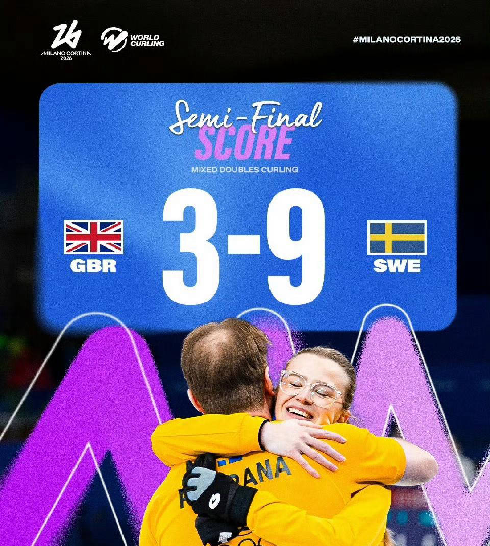 冰壶混双半决赛也出现爆冷,小组第4的瑞典队以9-3击败小组头名英国队,使得原本表现优异的英国队意外无缘决赛,只能参加铜牌战迎战东道主意大利。另一场半决赛中,美国队以8-7险胜意大利。最终决赛将由瑞典与美国展开激烈争夺,两支劲旅都志在桂冠。