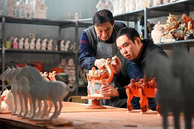 国家级非物质文化遗产唐三彩烧制技艺代表性传承人 高水旺(左)。图源:洛阳日报